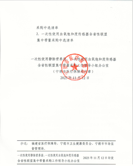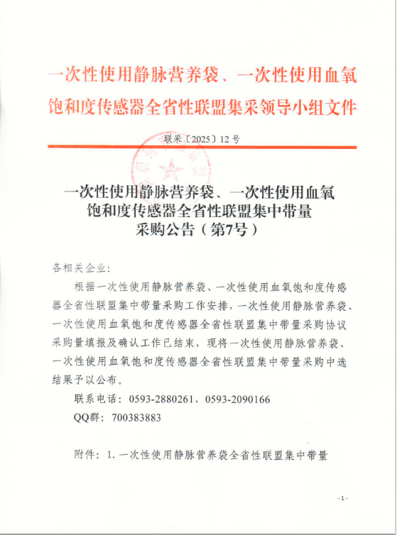 福建省寧德市一次性使用靜脈營養(yǎng)袋、一次性使用血氧飽和度傳感器全省性聯(lián)盟集中帶量采購公告(第7號)(官方群)