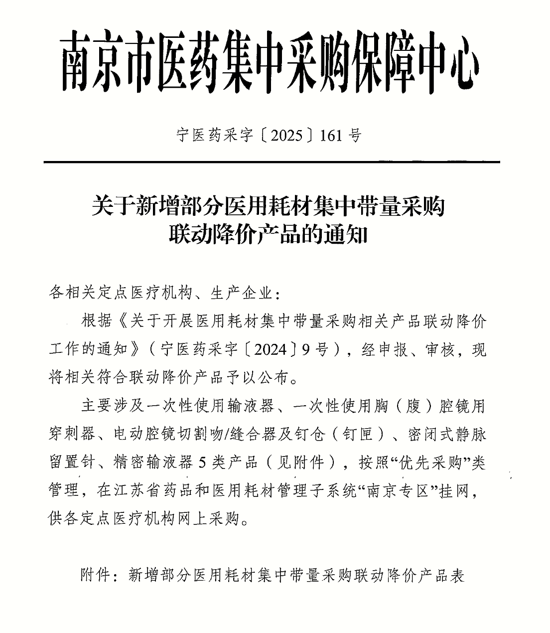寧醫(yī)藥采字〔2025〕161號—關(guān)于新增部分醫(yī)用耗材集中帶量采購聯(lián)動降價產(chǎn)品的通知(第二十四批)