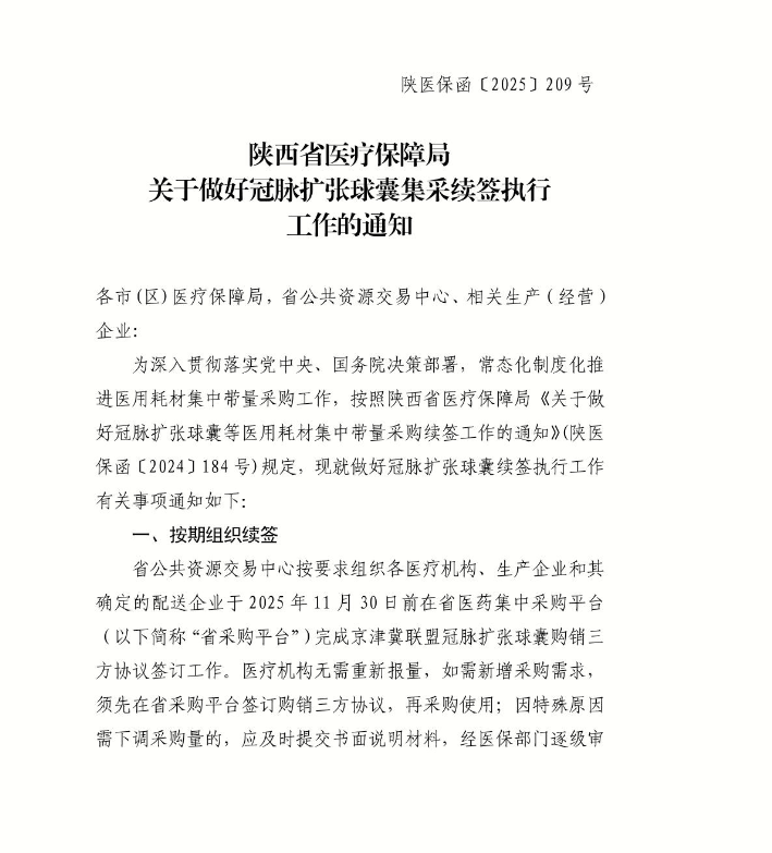 為深入貫徹落實黨中央、國務院決策部署,常態化制度化推進醫用耗材集中帶量采購工作,按照陜西省醫療保障局《關于做好冠脈擴張球囊等醫用耗材集中帶量采購續簽工作的通知》(陜醫保函〔2024〕184號)規定,現就做好冠脈擴張球囊續簽執行工作有關事項通知如下: