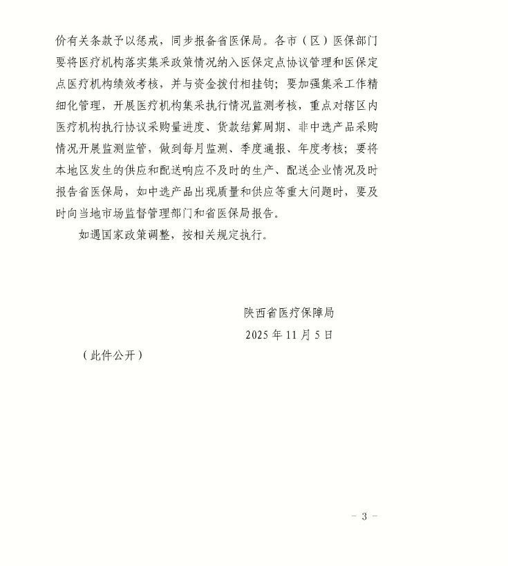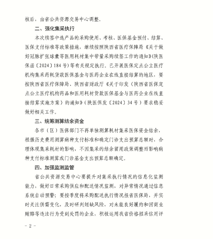本次續簽中選產品的采購使用、考核、醫保基金預付、結算、醫保支付標準等政策措施,繼續按照陜西省醫療保障局《關于做好冠脈擴張球囊等醫用耗材集中帶量采購續簽工作的通知》(陜醫保函〔2024〕184號)等有關規定執行。已開展醫保定點公立醫療機構集采藥耗貨款醫保基金與醫藥企業在線直接結算的地區,要按陜西省醫療保障局、陜西省財政廳《關于印發《陜西省醫保定點公立醫療機構藥品和醫用耗材貨款醫保基金與醫藥企業在線直接結算實施方案〉的通知》(陜醫保發〔2024〕34號)要求穩妥做好相關工作。