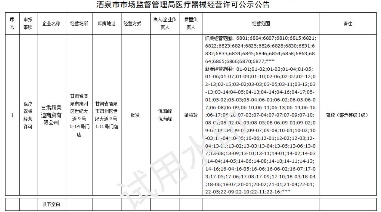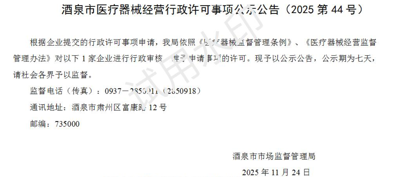 酒泉市醫(yī)療器械經(jīng)營(yíng)行政許可事項(xiàng)公示公告(2025第44號(hào))