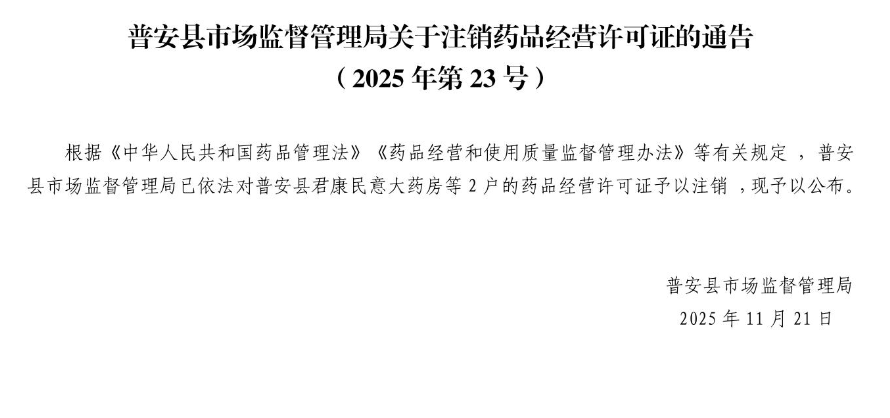 普安縣市場監(jiān)督管理局關(guān)于注銷藥品經(jīng)營許可證的通告(2025年第23號)